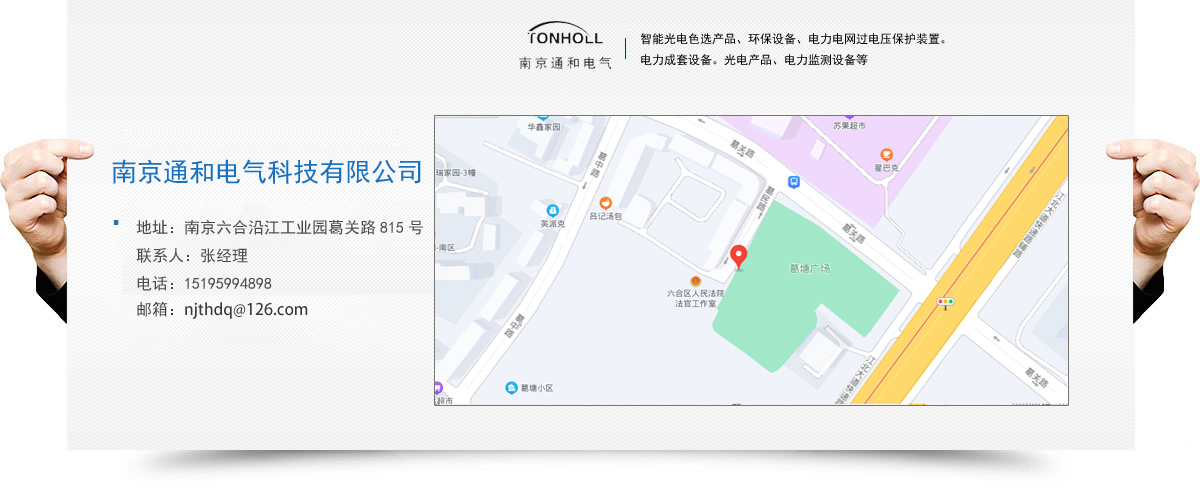 南京通和電氣科技有限公司是致力于研發(fā)、 生產防雷產品的科技型企業(yè)。公司集研發(fā)、生產、銷售、服務為一體,目前主要產品為:智能光電色選產品、環(huán)保設備、電力電網(wǎng)過電壓保護裝置。電力成套設備。光電產品、電力監(jiān)測設備等。公司秉承“誠信。創(chuàng)新、和諧。卓越”的經營理念,研發(fā)創(chuàng)新的專業(yè)態(tài)度服務客戶,追求卓越,以其高水準的產品品質和良好的企業(yè)信譽,在發(fā)展進程中得到了社會廣泛認可。